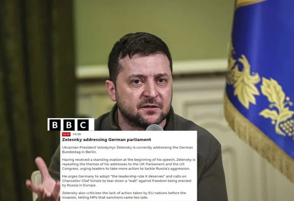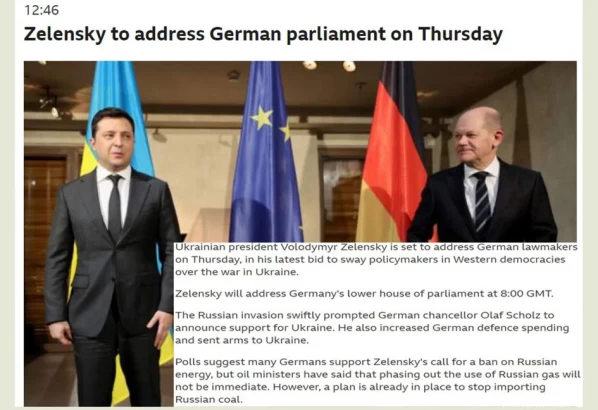 জার্মান সংসদের নিম্নকক্ষ ‘বুন্দেসটাগে’ ভাষণ দিলেন রুশ সামরিক অভিযানে বিধ্বস্ত ইউক্রেনের প্রেসিডেন্ট ভলোদিমির জেলেনস্কি। ভাষণের শুরুতেই তাকে দাঁড়িয়ে অভিবাদন জানান...